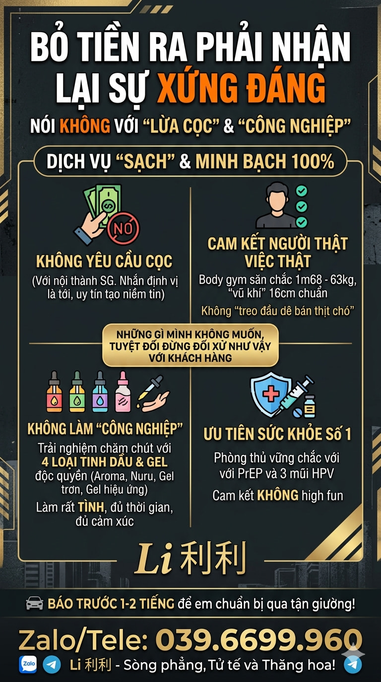 Ghét “lừa cọc”: Nên em KHÔNG YÊU CẦU CỌC (với nội thành SG). Nhắn định vị là em phi trâu tới, anh em sòng phẳng, uy tín tạo niềm tin. ![]()